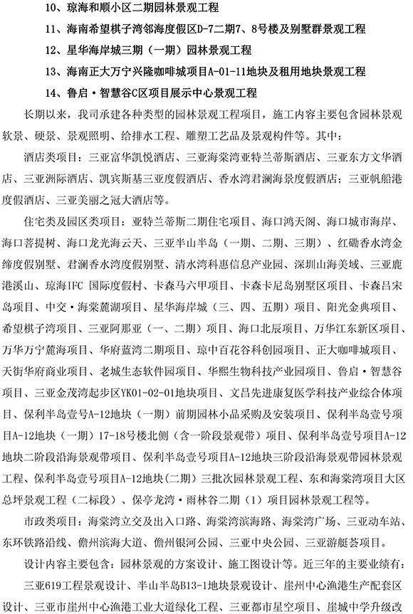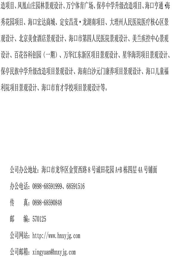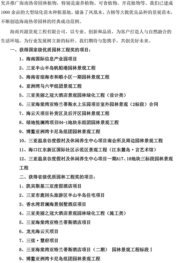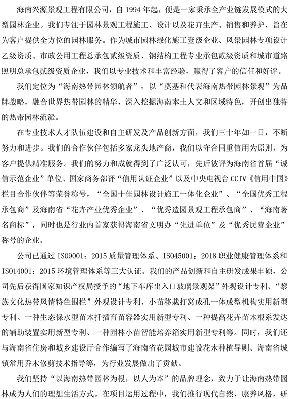 海南興源景觀工程有限公司成立于1994年,是一家集園林景觀工程設(shè)計、施工和花卉生產(chǎn)、銷售以及養(yǎng)護為一體的的全產(chǎn)業(yè)鏈發(fā)展的大型園林企業(yè),具有城市園林施工壹級企業(yè)資質(zhì)、風景園林專項設(shè)計乙級資質(zhì)、市政公用工程總承包資質(zhì)和城市道路照明總承包資質(zhì)……